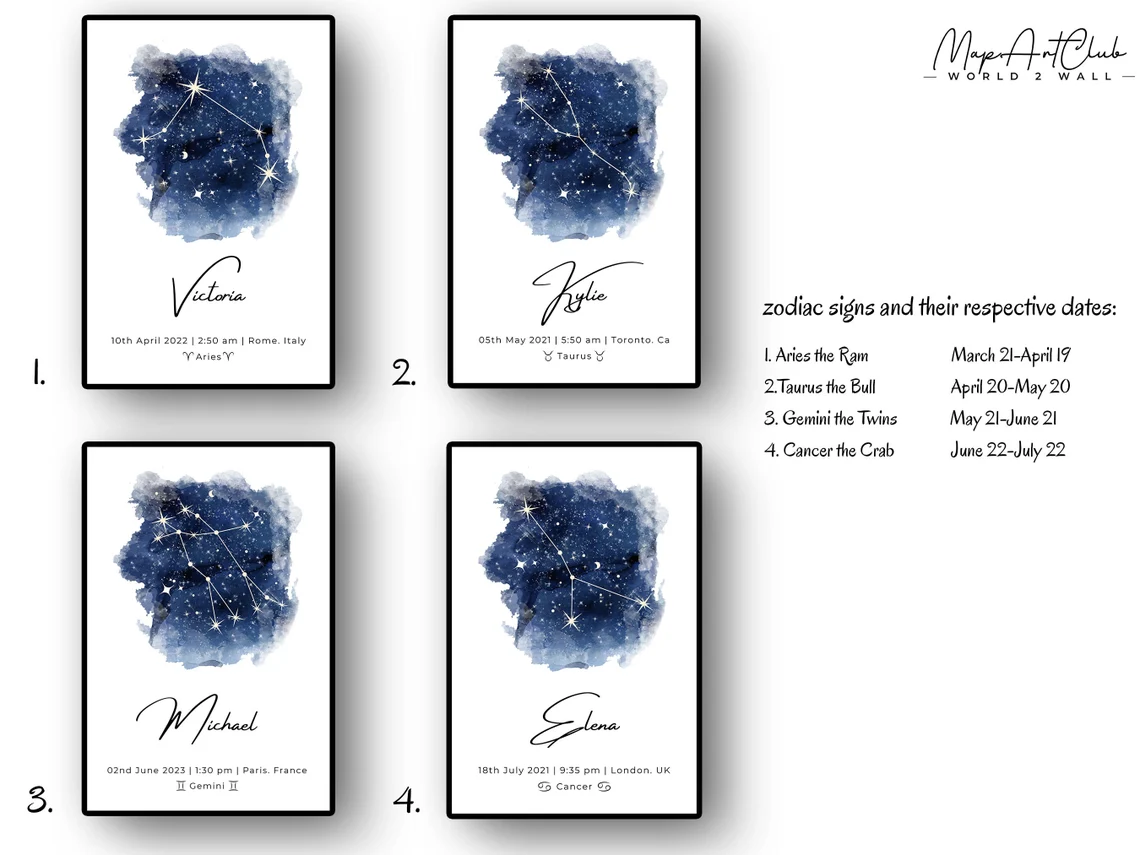 Looking for unique and personalized zodiac-themed wall art prints? Look no further than MapArtClub! Our custom watercolor constellation posters feature your child’s zodiac sign and are perfect for both boys and girls. These posters make for great baby shower gifts and newborn presents, and add a cute touch to any nursery. Explore our collection of Zodiac Signs Clipart and celebrate the day your little one was born with MapArtClub!