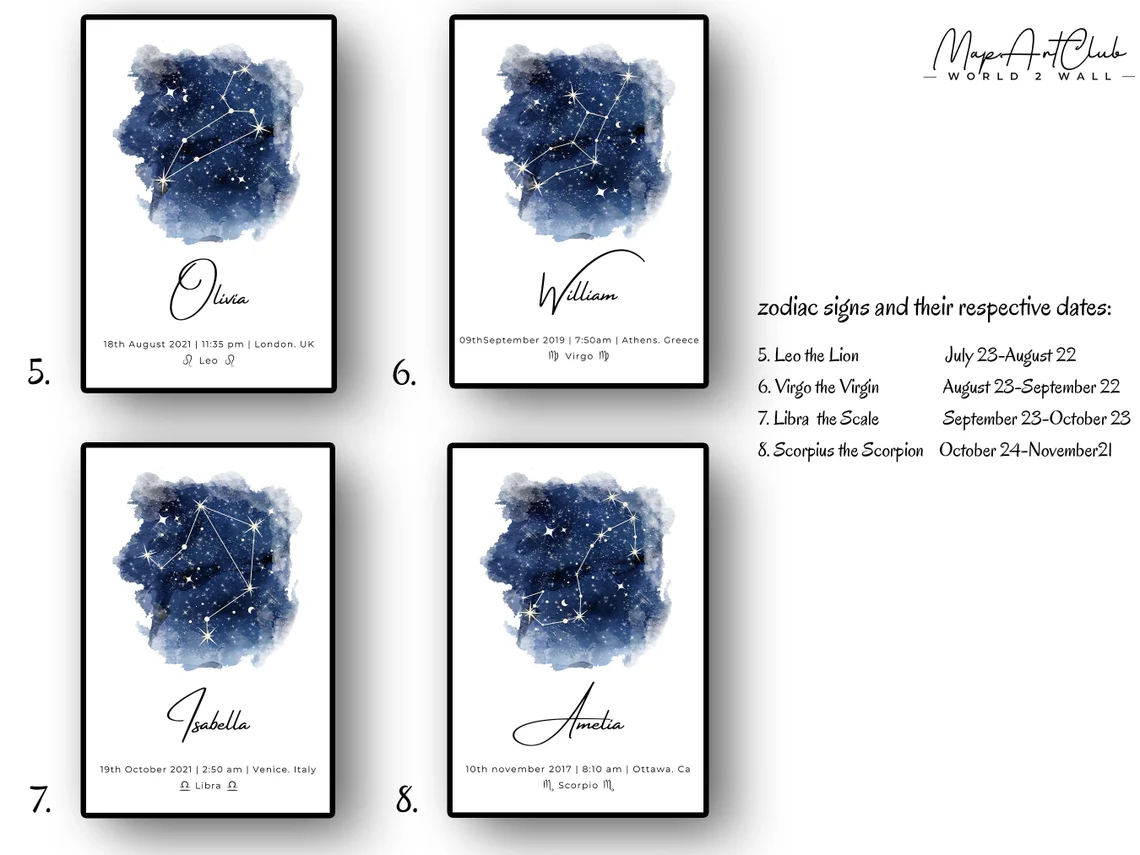 Be the first to review “Custom Watercolor Zodiac Signs Astrology Wall Art Print Custom Watercolor Constellation Zodiac Star Sign Posters for Her or Him” Cancel reply
