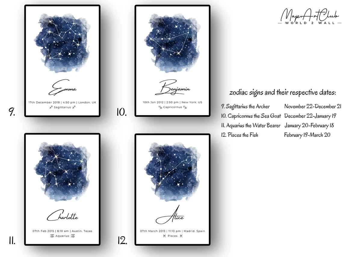 Custom Watercolor Zodiac Signs Astrology Wall Art Print Custom Watercolor Constellation Zodiac Star Sign Posters for Her or Him