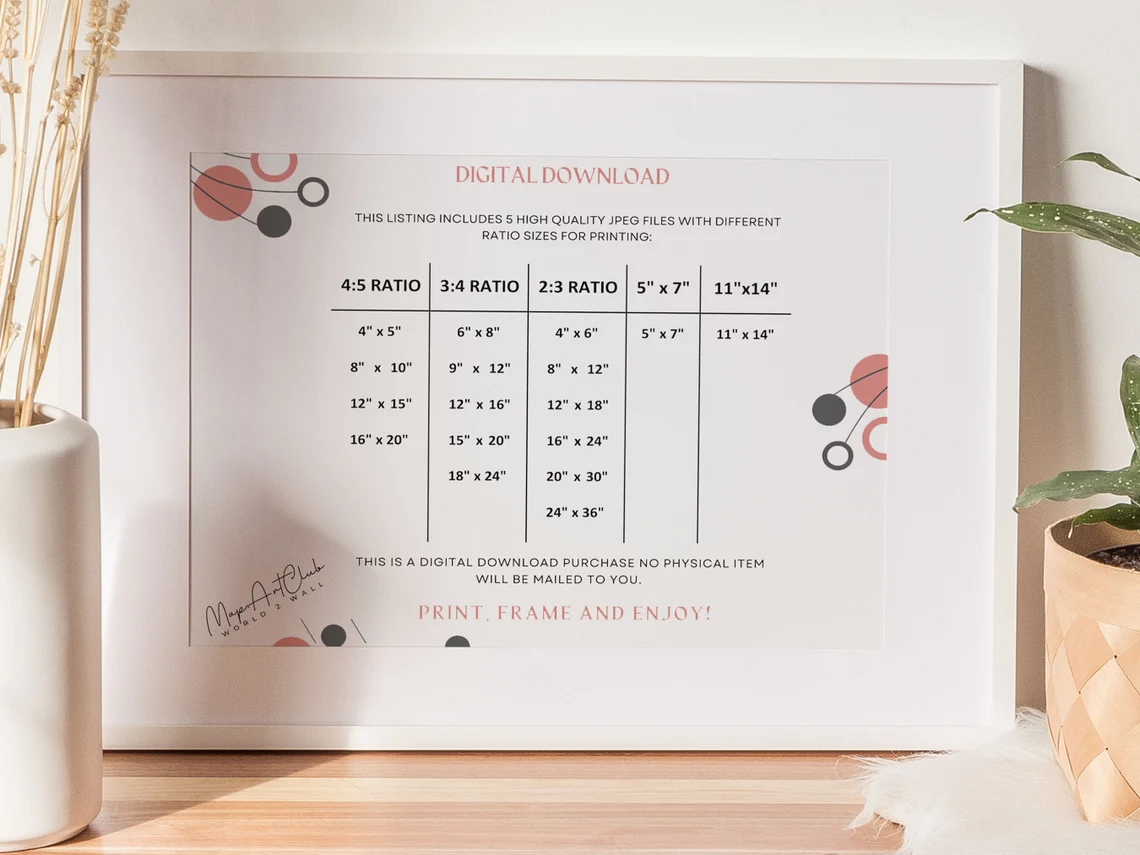 Please note that this is a DIGITAL DOWNLOAD listing. No physical product will be shipped, and the frame is not included. Colors may vary slightly when viewing on different monitors. You can order frames from retailers such as IKEA or Walmart, which offer a variety of sizes and styles that fit the design sizes.