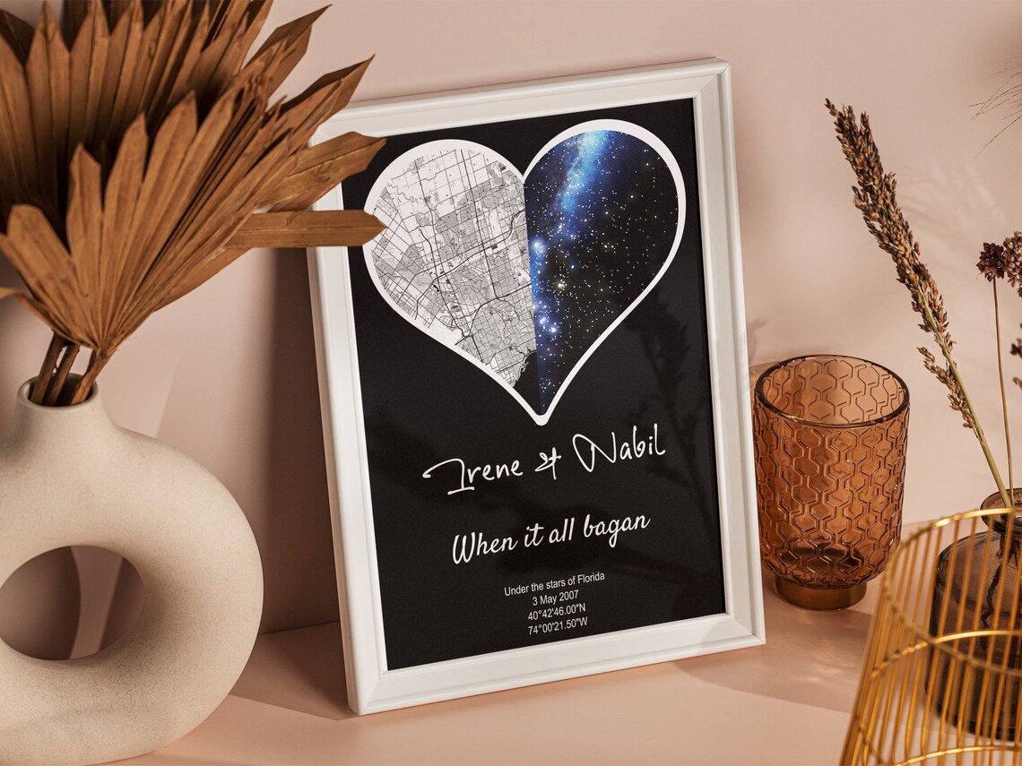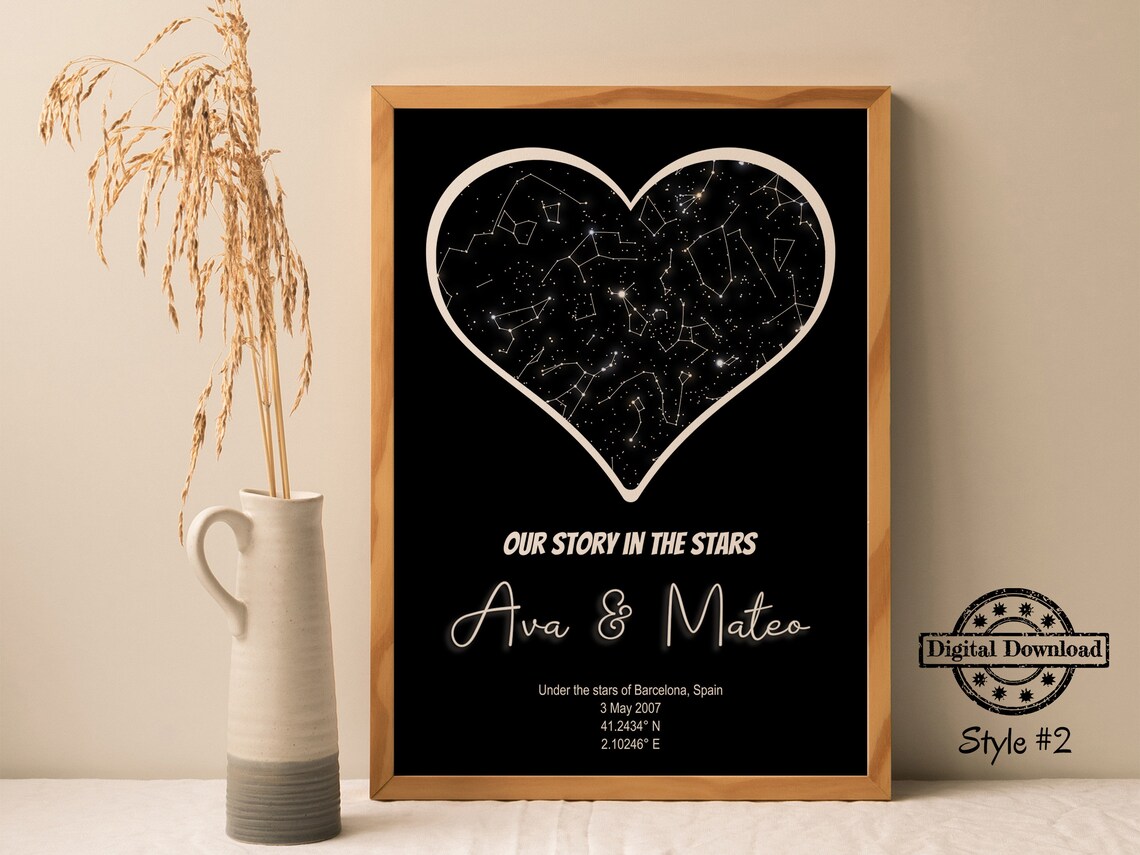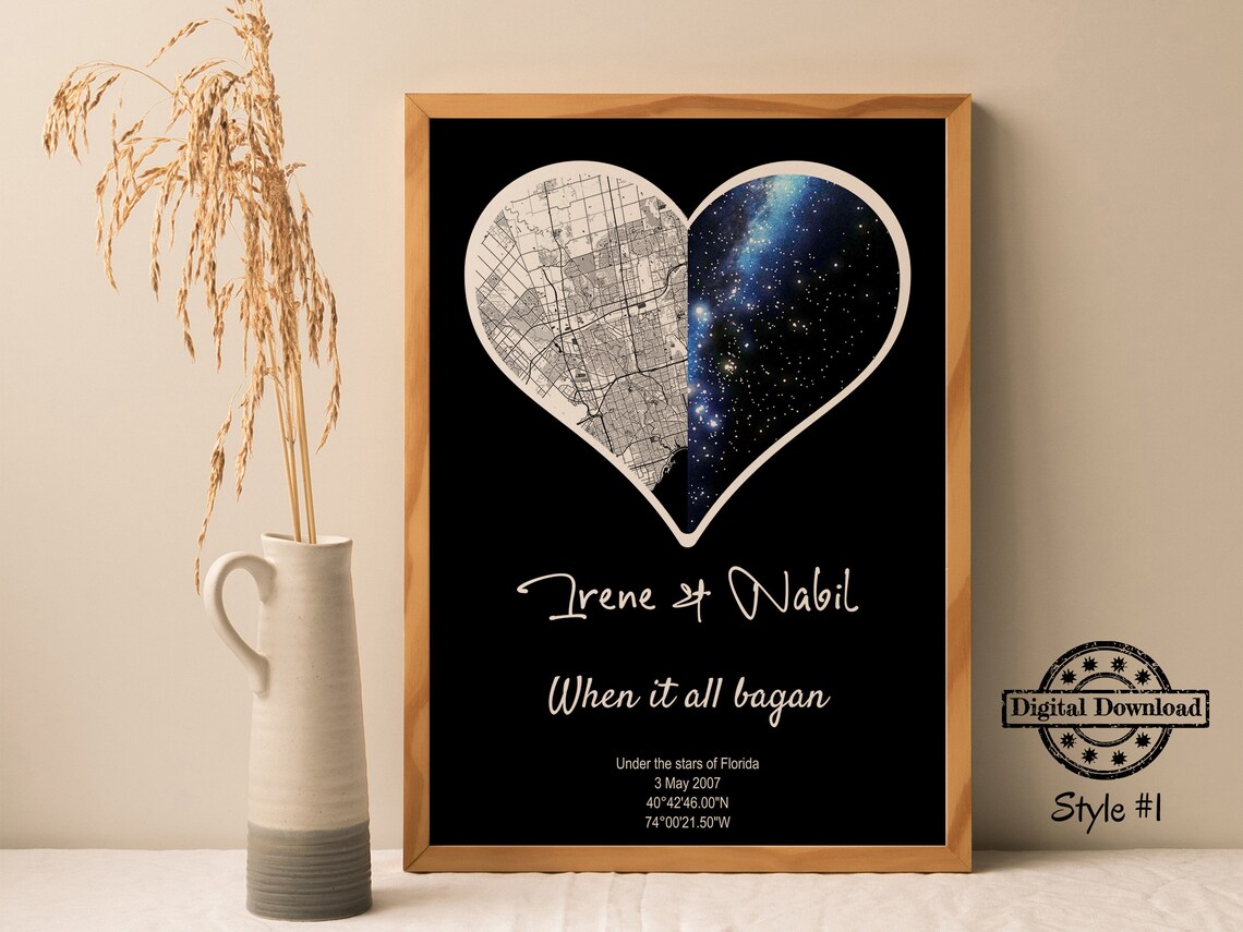 ❤️ MapArtClub ❤️ offers personalized star map by date prints, custom star map night lights, and where we met maps to commemorate special moments in your life. Our night we met stars prints are perfect for couples celebrating their anniversary or one year dating gift. Our star maps also make great gifts for Valentine’s Day, Mother’s Day, or to celebrate the first year of your relationship. Customize your own birth star map or the star map of your first date with MapArtClub.
