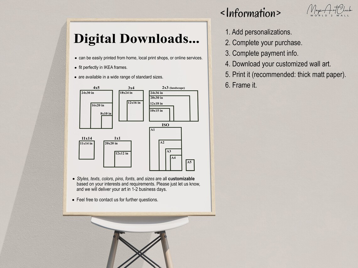 Please note that this is a DIGITAL DOWNLOAD listing. No physical product will be shipped, and the frame is not included. Colors may vary slightly when viewing on different monitors. You can order frames from retailers such as IKEA or Walmart, which offer a variety of sizes and styles that fit the design sizes.